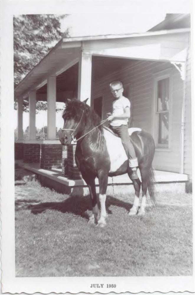 ID: Black and white photograph of a young white boy on the back of a brown horse, in front of the porch of a house with white siding. The boy has blond hair and glasses.
